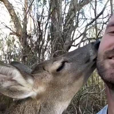 Bonehead woman tries to hug a wild deer after feeding it. Deer kicks woman 5 or 6 times in the back of the head & neck to get her away. Short recovery. Woods.