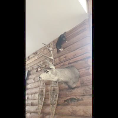 A cat grabs on to a taxidermy deer head as they jump off of a wall in a log cabin to climb down.