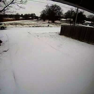 A wild deer runs across a driveway, then slips and falls on ice and slides away. Security footage.