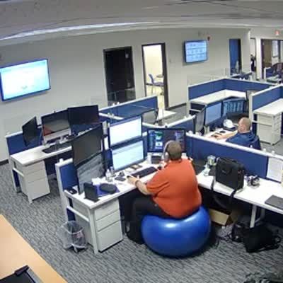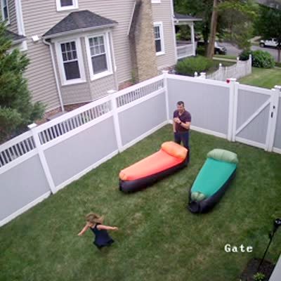 A young girl runs and jumps on an inflatable lounge chair in a yard. A grown man runs and jumps on the lounger and it pops. Home security footage.