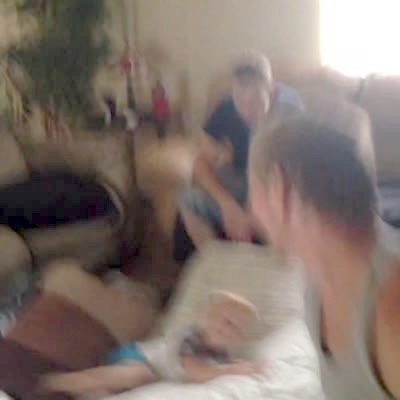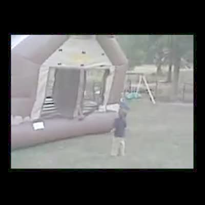A man lays a young boy on an partially deflated bounce house and jumps on it and launches him over the fence in the backyard. Security footage.