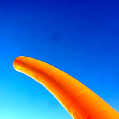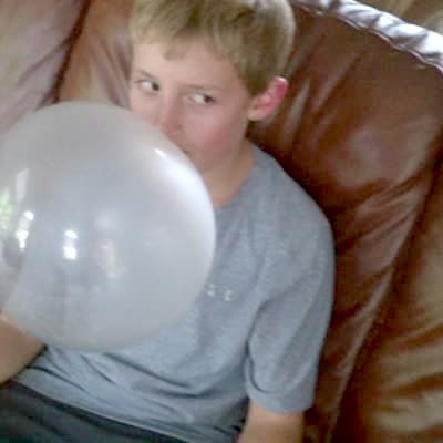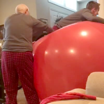 A teen boy lays on a giant balloon as two men blow it up, and then it pops and he falls.