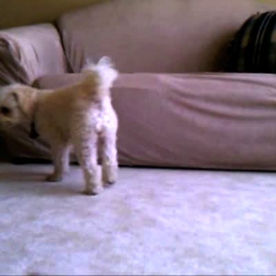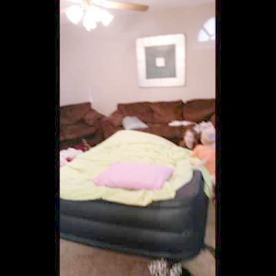 A man bounces his young son on a deflated air mattress when the boy flies into a table by a couch and knocks a lamp over.