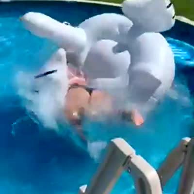 A woman belly flops onto a swan pool float and breaks the wing off in a pool.