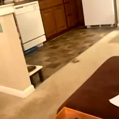A woman deflates a large balloon towards a cat in a kitchen and the cat jumps up high.