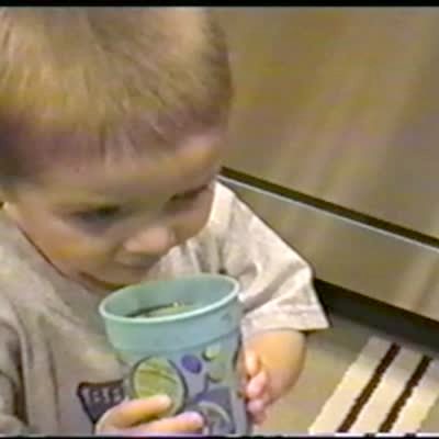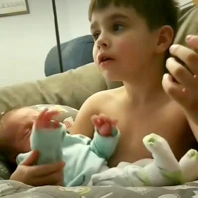 A baby boy cries in a tot boy's arm, then the tot boy says "mom, baby needs a boob" in a living room.