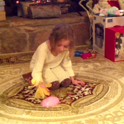 "Fireplace Fairy" A girl demonstrates how to use her new flying fairy doll in a living room next to a fire place and the fairy flies up and veers directly into the fire place.