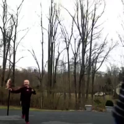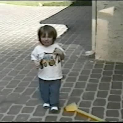 Tot boy steps on toy hoe rake and it hits him in the face.