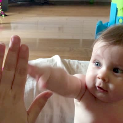 A woman holds her hand out to teach her baby how to high five in the living room. As the baby reaches out to touch her, a dog walks over and gives the woman a high five.