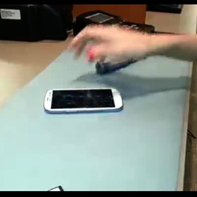 A woman demonstrates a screen protector on her phone, and breaks her phone.
