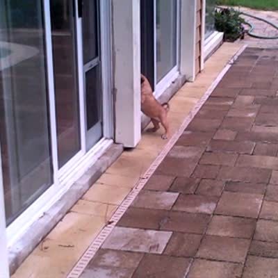 A puppy dog scratches at a window to be let inside while a dog demonstrates how to use the doggy door until the puppy tries it.