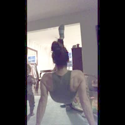 A woman demonstrates and exercise and her tot son takes the camera and runs away with it.