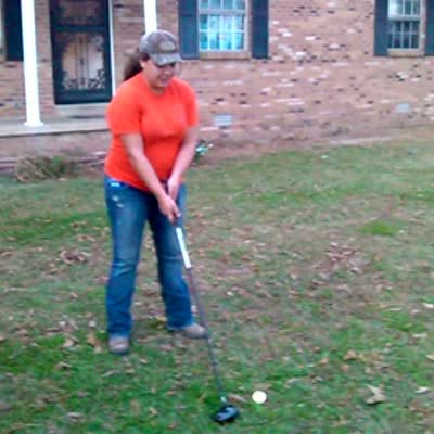 A woman demonstrates how to swing a golf club to another woman an hits her in the face at :33.