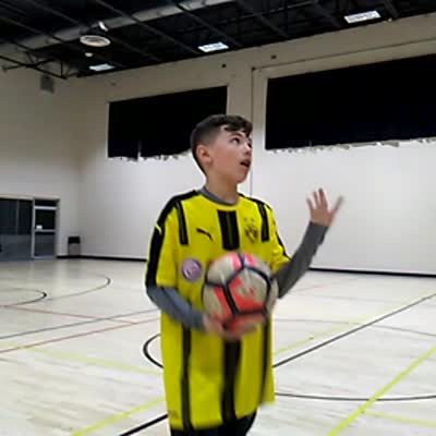 A young boy tells the camera what he is going to do. He is in a gym. He has a soccer ball. he is going to kick the ball to the ceiling. He goes to demonstrate. The ball gets stuck on something on the ceiling. The other boys with him laugh. The boy who kicked the ball is confused.