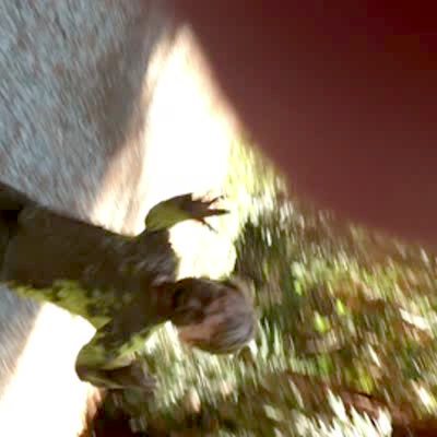 A young boy demonstrates to the camera how to dribble a basketball outdoors and knocks the camera/ iPod onto the ground at :41. He picks it up, sees that he broke it, and looks scared.