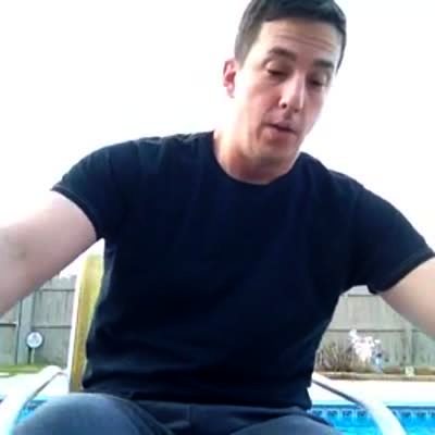 A man demonstrates how to use a resistance band next to a swimming pool. He stretches it on his foot, it snaps into his face, and he falls into the pool.