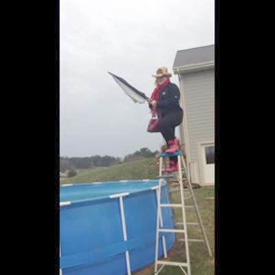 A woman stands on top of a ladder and prepares to jump into an above ground pool fully clothed as part of a cold water challenge, but when she goes to jump, the ladder falls over and she falls into the side of the pool, denting it.