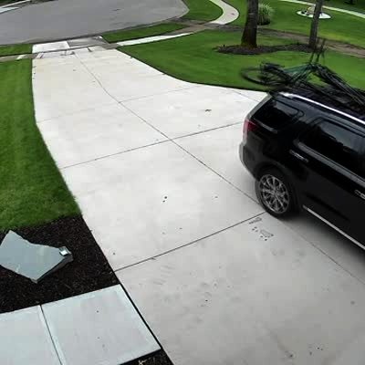 A man pulls into a garage with a bike mounted on top of the car. It destroys the bike, breaks the sunroof and dents the top of the car. Driveway. Security footage.