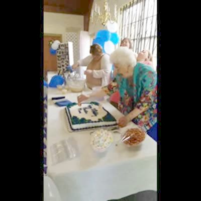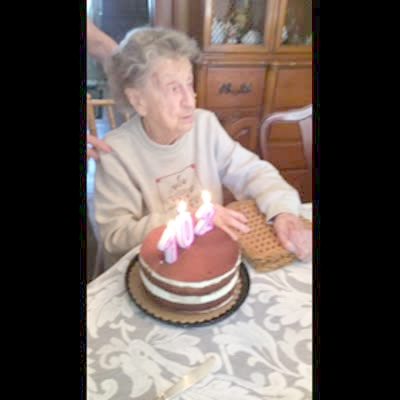 A senior woman accidentally blows out her dentures while trying to blow out the candles on her birthday cake indoors.