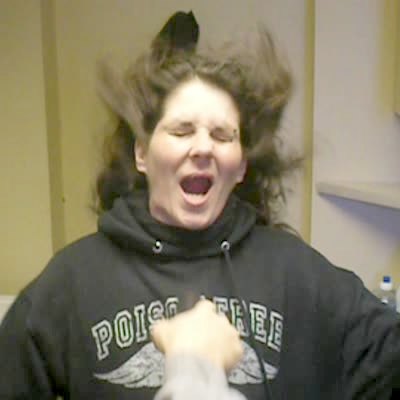 A woman crouches under an automatic hand dryer in a public bathroom at :10, her cheeks flap from the air, and her false teeth/ denture fly out.