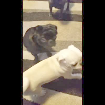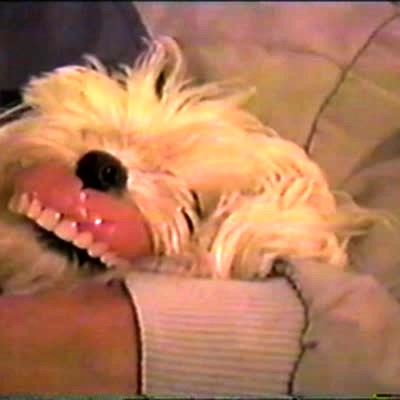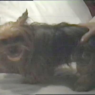 Yorkie has grandpa's teeth in his mouth and he won't let them go. Funny but the lighting varies wildly (mostly dark). Angry dog. Dentures.