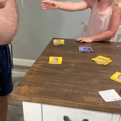 A man wraps a string around his dentures. He tells a tot girl to pull his loose tooth. Then she pulls his whole denture out. They laugh.