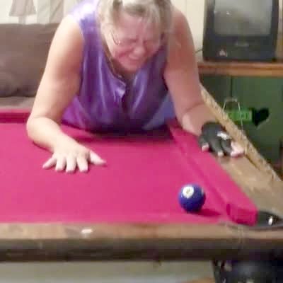 A senior woman tries to blow a billiard ball into a corner pocket in the house, and her dentures fall onto the pool table.