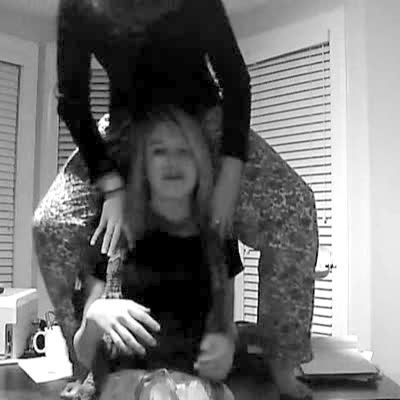 2 teen girls fool around and 1 climbs the other girl's shoulders. They fall over a desk and laugh.