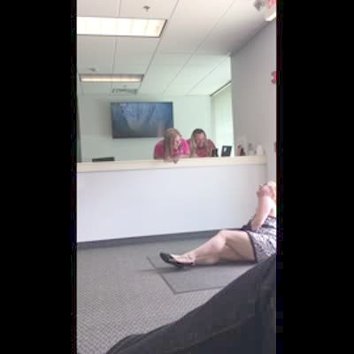A young woman walks into an office and three other young woman stand up from behind a desk and scream. The young woman then screams at them and falls down.
