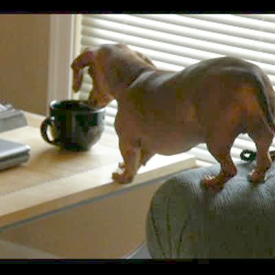 Dachshund dog tries to climb off a chair onto a desk. He falls down to the floor.