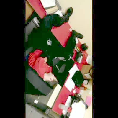 A teen girl works on a computer then the desk collapses and she catches the computer and laughs at school. Security footage.