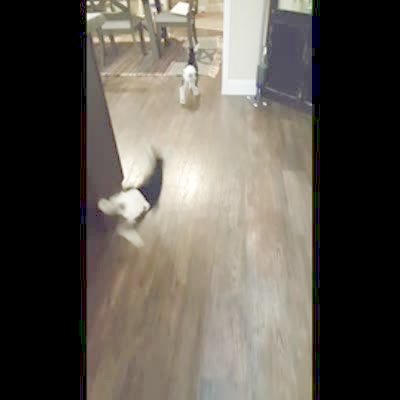A poodle dog wears a diaper and flips around repeatedly in the living room. No audio.