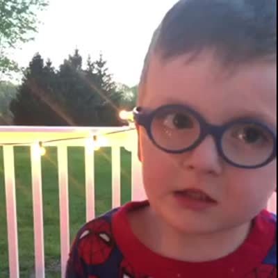 A young boy flexes his muscles in a bathroom and makes a funny face and says "take picture now, you'll miss my muscles" and a man laughs and tells him it's a video and the boy makes a surprised face and says "What?" Animotica video.