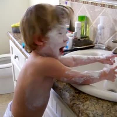 Tot boy in diapers has cream all over his face. Mom asks if he was playing with cream & he says no, as he washes his hands in the bathroom sink. Mess.