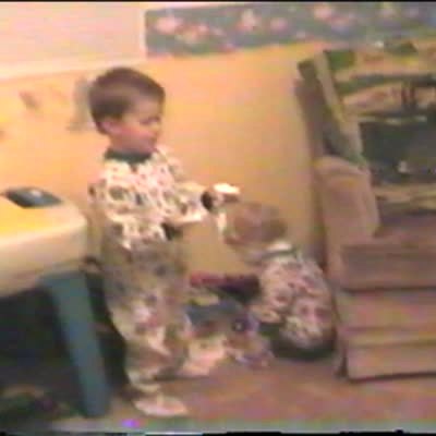 A woman says that her tot boy figured out how to open diaper cream, then she shows that he put it on a dog's butt in a living room.