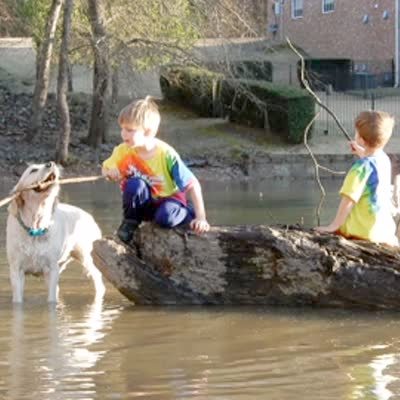 A boy swings on a rope swing over a lake. As he jumps off the swing to jump into the lake, his leg gets tangled up in the rope and he hangs upside down from the rope and splashes into the lake. Short tails.