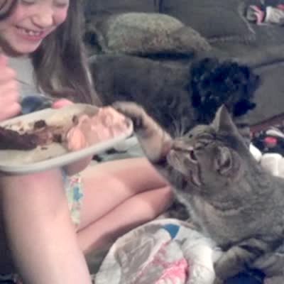 A cat repeated dips its paw in a girl's ice cream on a couch and eats it.