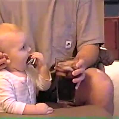 Baby boy dips his pacifier into Dad's glass of soda & puts it back in his mouth over and over.