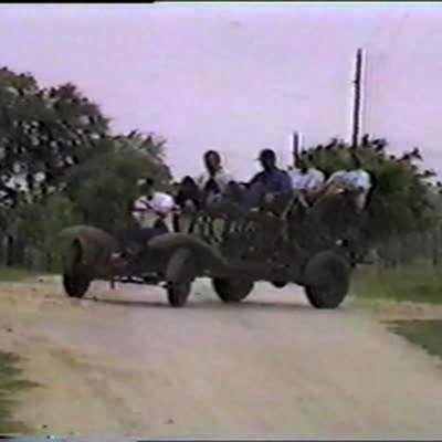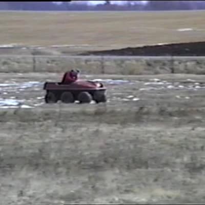A woman rides on a seat attached to the back of a truck until it hits a ditch and the seat detaches and the woman falls off into the dirt
