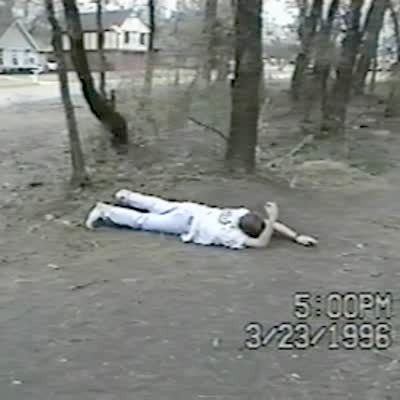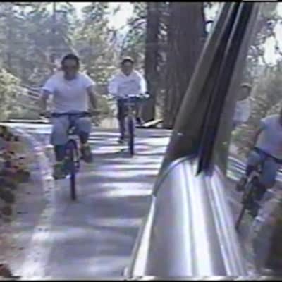 Teen boy lays down in dirt, other teen boy rides his bike over but misses the jump & rides over teen's head. Boy is okay. Trick, stunt. Boneheads.