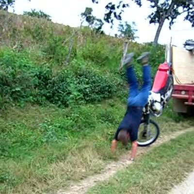 Man drives a motorcycle out of the back of a pickup truck on a dirt road, flips over the handle bars, and falls down on his face.