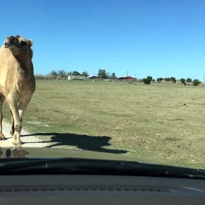 A camel walks on a dirt road in a safari park while a family watches. The camel puts its head in the car window and eats a paper bag full of food and then scratches its nose on the car.