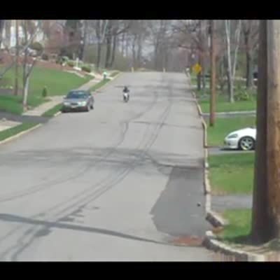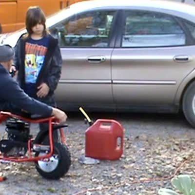 Boy sits on a small dirt bike in a front yard after a man turns it on. The boy rides across a road and crashes into a parked car in a driveway. Short tails.