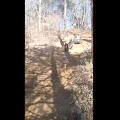Two men race down a dirt hill in the woods on kid's toy cars. The second man crashes and flips while the car rolls down the path.