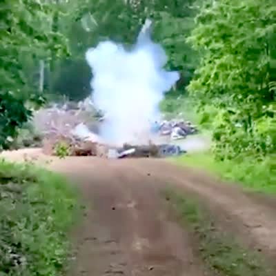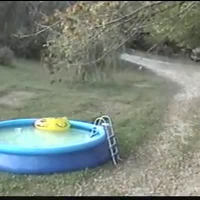 Car drives down a dirt road and smashes into a full kiddie pool in the yard. Water splashes everywhere.