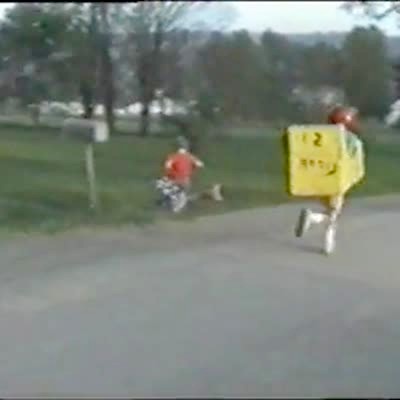 Boy races his brother down a dirt road wearing a cardboard soapbox derby racer costume. He trips, falls down and flips over.