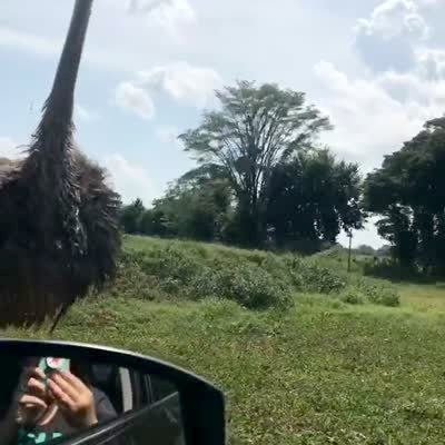An ostrich bird walks over to a car at a drive through safari, and the woman behind the camera says "hi" to it. Then it bites her phone and walks with it, but it drops the phone on the ground, and the woman takes it back.
