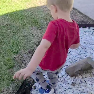 A tot boy tells a woman that "Bad Cooper" threw rocks in the grass yard and calls himself "Good Cooper." Then she asks if he should go to time out and he says "yeah, where is Bad Cooper" and the woman says "I'm looking at him." The boy turns and looks at her and says "me!?"