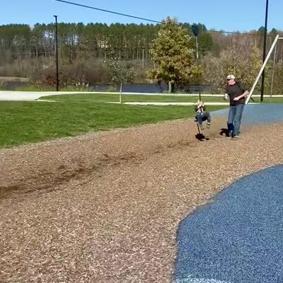 A man pushes a young boy on a zipline on a playground. The zipline stops suddenly at the end and flings the boy off the ride and he falls to the ground.