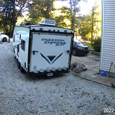 A man carries a bucket of stuff from an RV. He trips over a rock and slams into a wall. Security Camera Footage.
